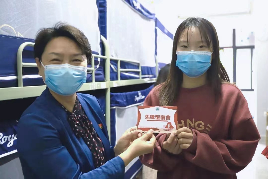 刘书记为获奖宿舍颁奖